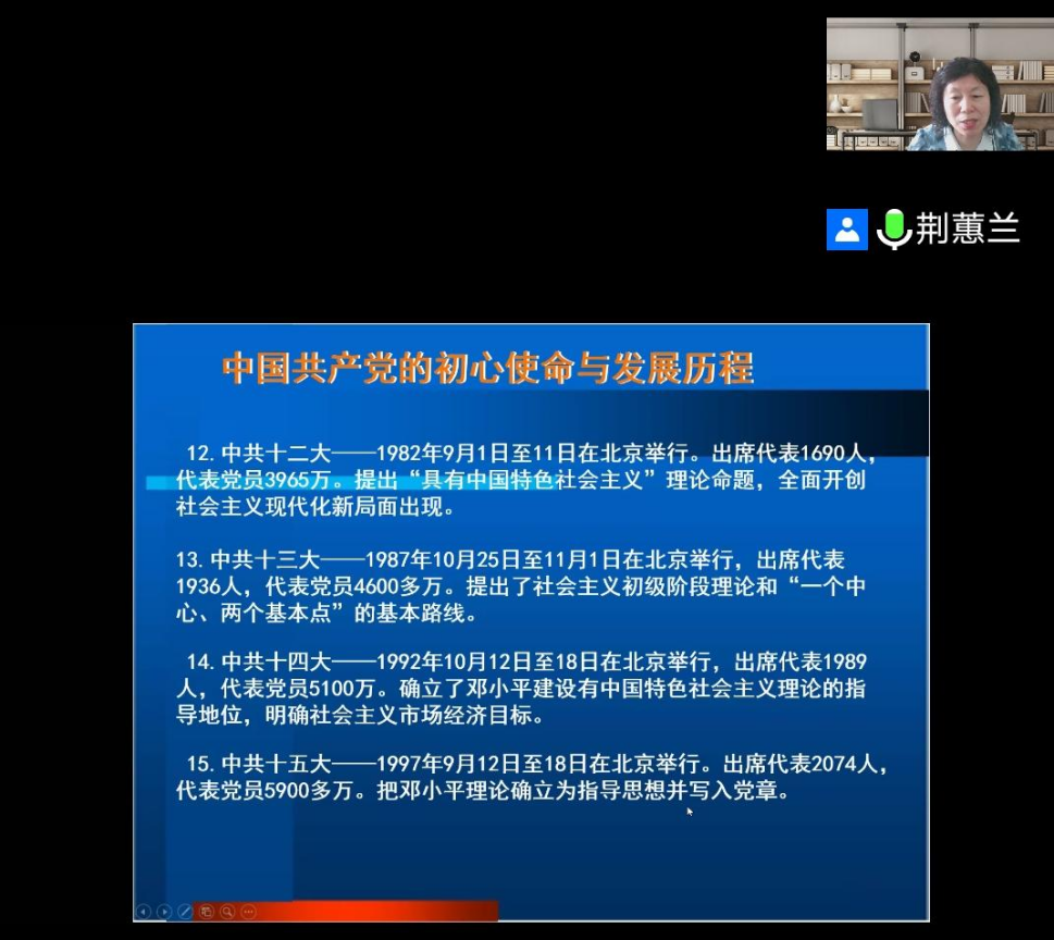 荆蕙兰教授从“中国共产党的初心和使命”“新时代中国共产党的建设面临的新形势新课题”“全面推进中国共产党的建设新的伟大工程”三方面入手,通过梳理重大事件、重要会议以及重要文件和人物,结合文字、图像、视频等方式,讲感受、话初心、谈使命,带领师生重温了中国共产党波澜壮阔的百年画卷,全面深入总结了中国共产党百年奋斗的光荣传统、宝贵经验和伟大成就,阐明了中国共产党顺应、把握、引领时代潮流的伟大发展历程,激励青年学子坚定理想信念、练就过硬本领,厚植爱国情怀、矢志艰苦奋斗,传承红色基因、担当复兴重任。