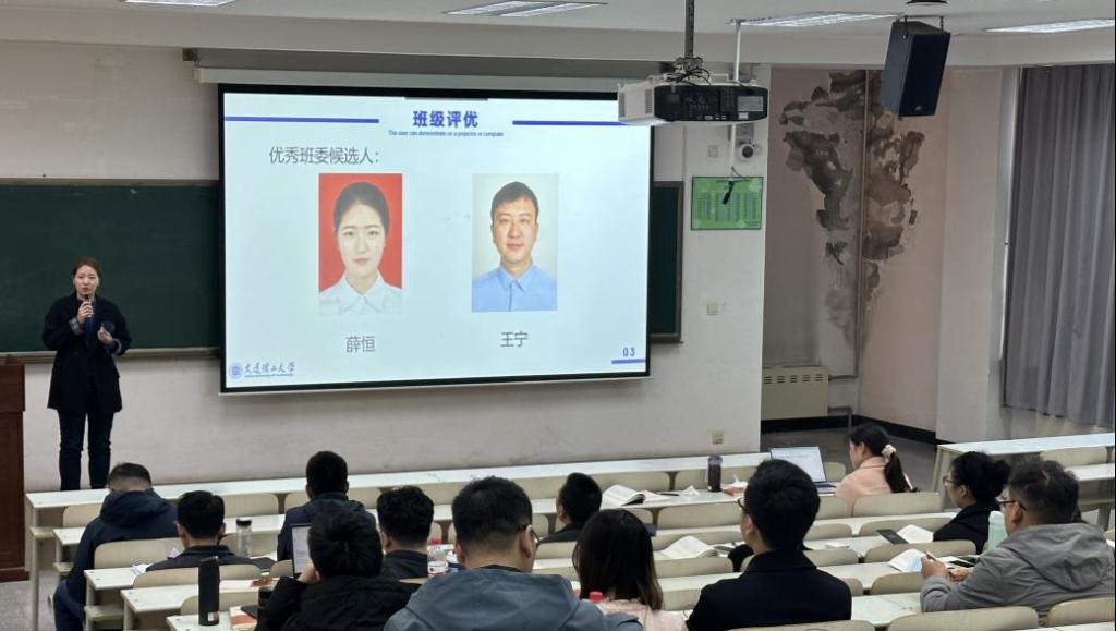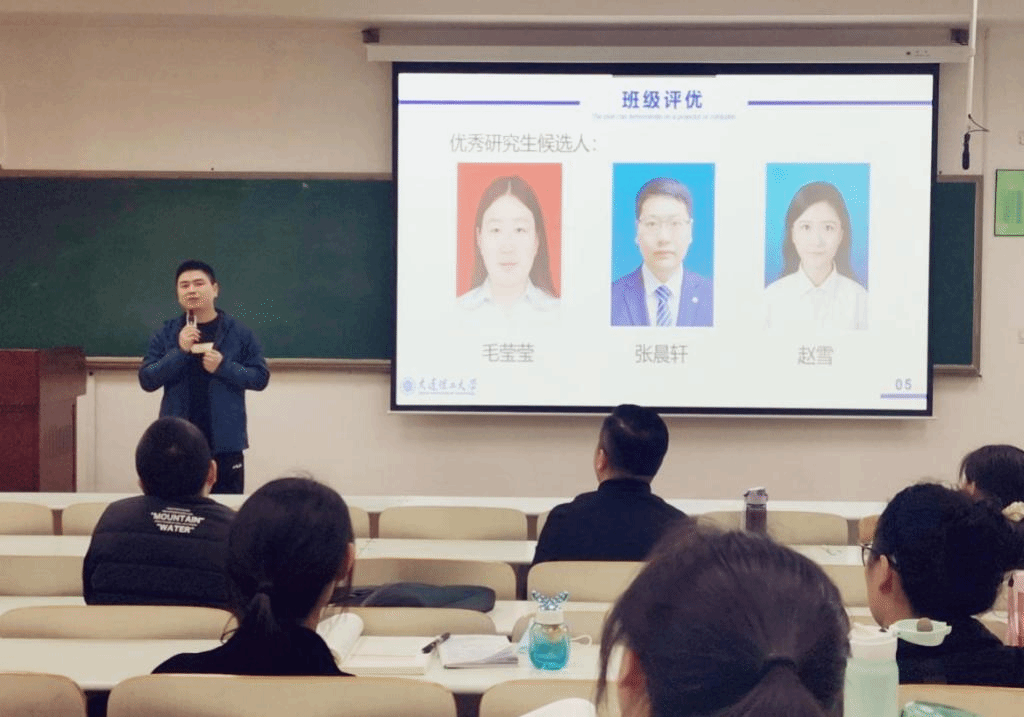 班长方亚辉在对本次优秀研究生和优秀班委的评选办法和规则进行简单介绍后,评优竞选正式拉开帷幕。候选人依次上台演讲展示。参加竞选的同学主要从思想政治、业务学习、科研成果、专业实践及获奖情况五个方面进行汇报。展示过程中,不难看出竞评学生的努力与拼搏,他们扎实的工作作风、刻苦的学习精神、优秀的学习成果赢得了全班同学的认可。竞选演讲环节结束后,全班同学开始进行无记名投票。