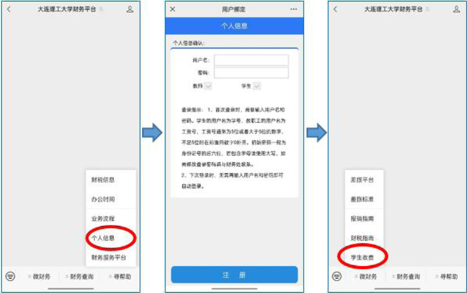 (3)微信缴费:搜索公众号“大连理工大学财务平台”,点击“寻帮助-个人信息”进行注册登录,登录成功后点击“查询缴费-学生收费”进行学杂费缴费。