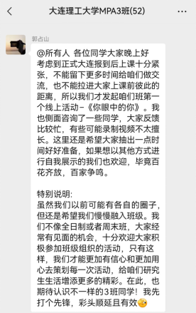 在开学前,MPA2023级三班班委会精心组织了《我眼中的你》活动并编制了集中授课大工MPA学习生活指南,加深同学们之间的初步了解,也为大家的新生生活提供了初步向导。
