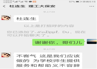 进了八角楼也得到了热情的迎接。值班人员和保洁员主动过来,扶着我找上课地点。我看时间还早,慢慢走出来在楼前晒太阳。这时,巡逻回来的保安人员看到我,又急急忙忙的从他们的值班室给我拿了一把椅子,端来了一杯热水,让我非常感动,也特别激动。等下课我从楼里走出来并慢慢侧着身下台阶,开着小电瓶车的保安人员又出现在我面前并说要送我回宿舍。此时此刻我真的非常感动,真不知道怎样表达我此时的心情。赶紧让旁边的人帮忙拍了个照,要了这位保安的微信。回宿舍用微信再次向他表示了感谢。他说“不客气,这是我们应该做的,为学校师生提供服务和帮助义不容辞”。简单的话语,道出了一份真情,道出了以帮助别人,关爱别人,传递正能量为使命的责任和担当。